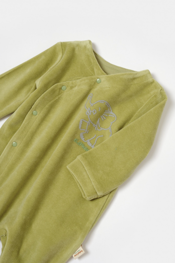 Salopeta Elefant cu maneca lunga si botosei din 80%bumbac organic si 20% poliester Verde 0-3 Luni