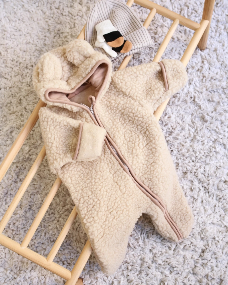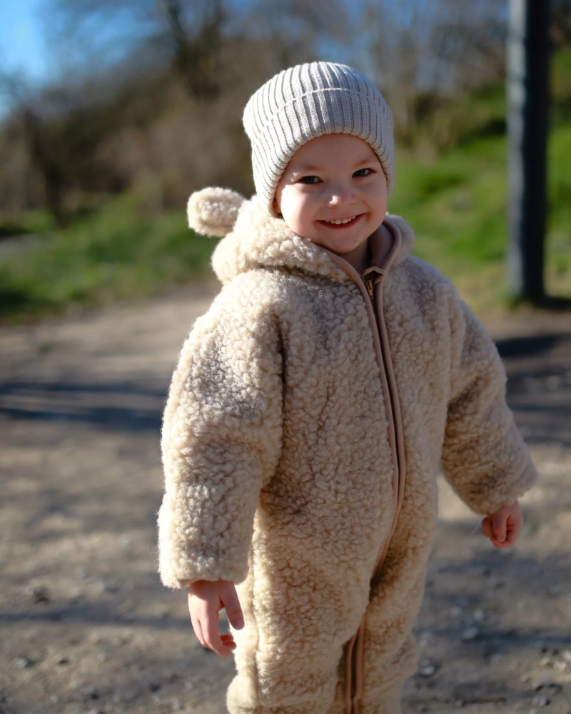 Descoperă confortul suprem pentru zilele reci cu salopeta groasă din lână merinos 100% naturală, în varianta „Ursuleț de pluș” – o țesătură moale, densă (380 g) și respirabilă, creată special pentru pielea sensibilă a bebelușilor.