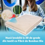 1. Husa Bio Bamboo, este foarte placuta la atingere, aspectuoasa, de culoare alb cu imprimeuri verzi, cu tesatura speciala pentru o foarte buna aerisire, este usor detasabila, prevazuta cu fermoar si este lavabila la 30 grade.