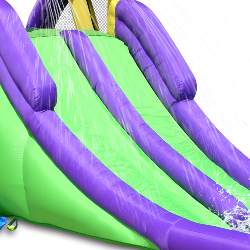 Toboganul gonflabil dublu asigura 3 activitati distractive: catarare, alunecare si racorire in piscina de la baza.