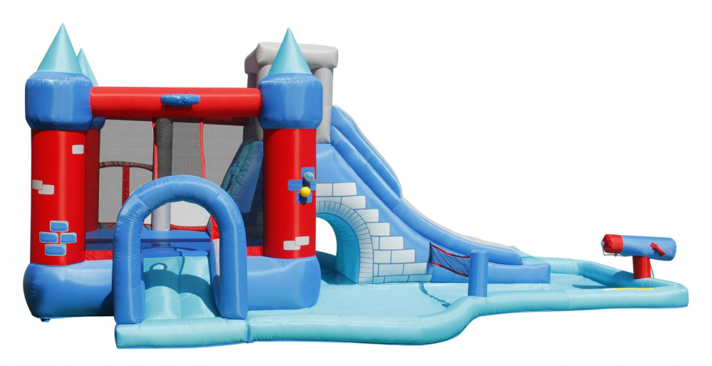 Saltea gonflabila Splash Park cu doua tobogane, spatiu de catarat, tun cu apa, loc pentru sarituri, cos de baschet si darts