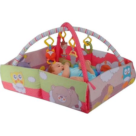1.Joaca pe spate cu jucariile ce atarna pe bara de jucarii, intr-un spatiu in care se simte protejat (lateralele fiind inchise). Bebelusul isi va exersa abilitatile de coordonare si de prindere.