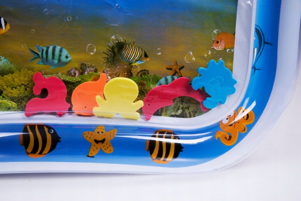 In interiorul covorasului se afla animale marine colorate, care se misca odata cu miscarile copilului, captandu-i atentia si stimulandu-i curiozitatea.