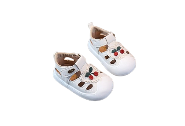 Sandale albe pentru fetite, ideale pentru sezonul cald, cu design decupat si decoratiune delicata in forma de inimioara brodata cu cirese.