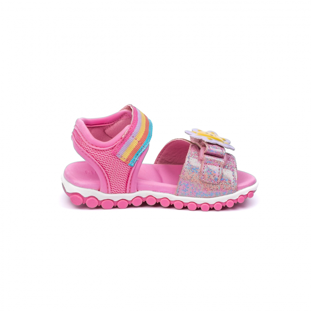 Sandale cu design super distractiv, din material textil si sintetic stralucitor, doua inchideri cu velcro pentru a fi mai usor de purtat si un nor dragalas aplicat pe bareta.