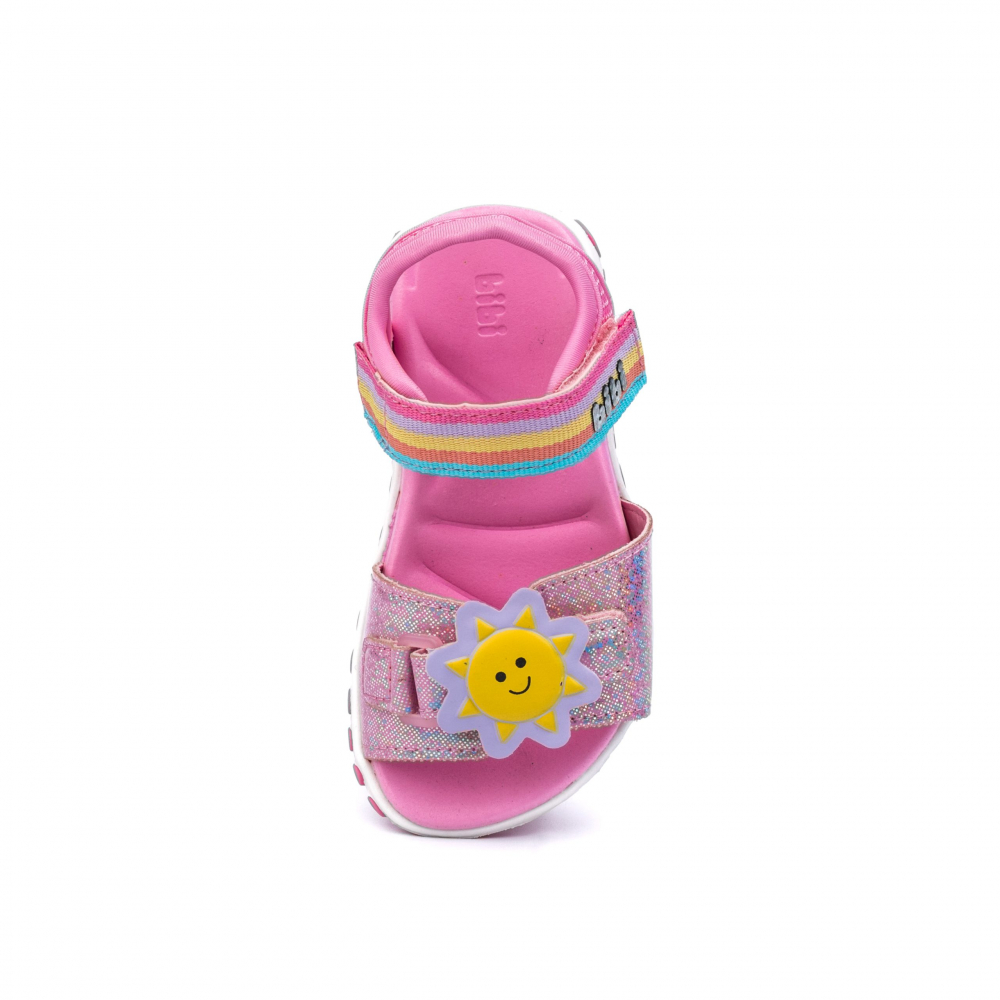Sandale cu design super distractiv, din material textil si sintetic stralucitor, doua inchideri cu velcro pentru a fi mai usor de purtat si un nor dragalas aplicat pe bareta.