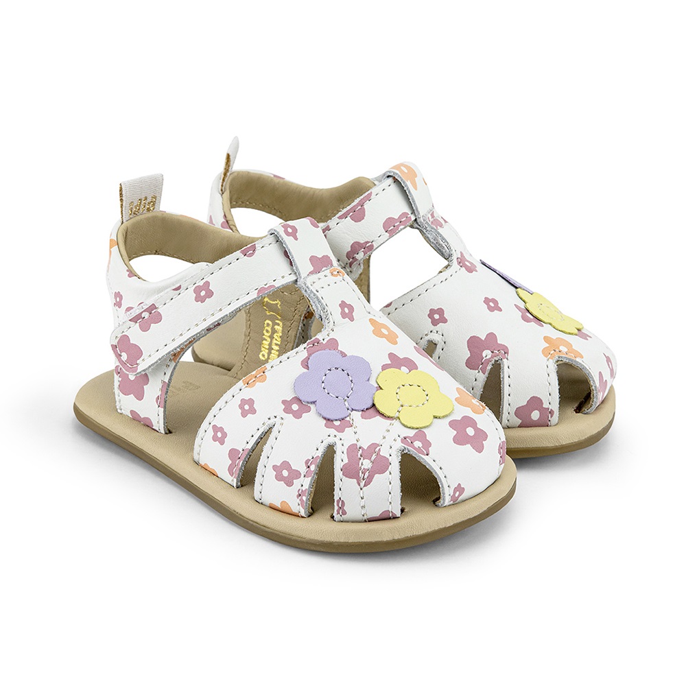 Au un design super delicat, cu detalii serigrafiate si doua aplicatii flori, inchidere cu velcro care ofera reglare usoara si protejeaza piciorusele, lasandu-le sa se dezvolte natural.