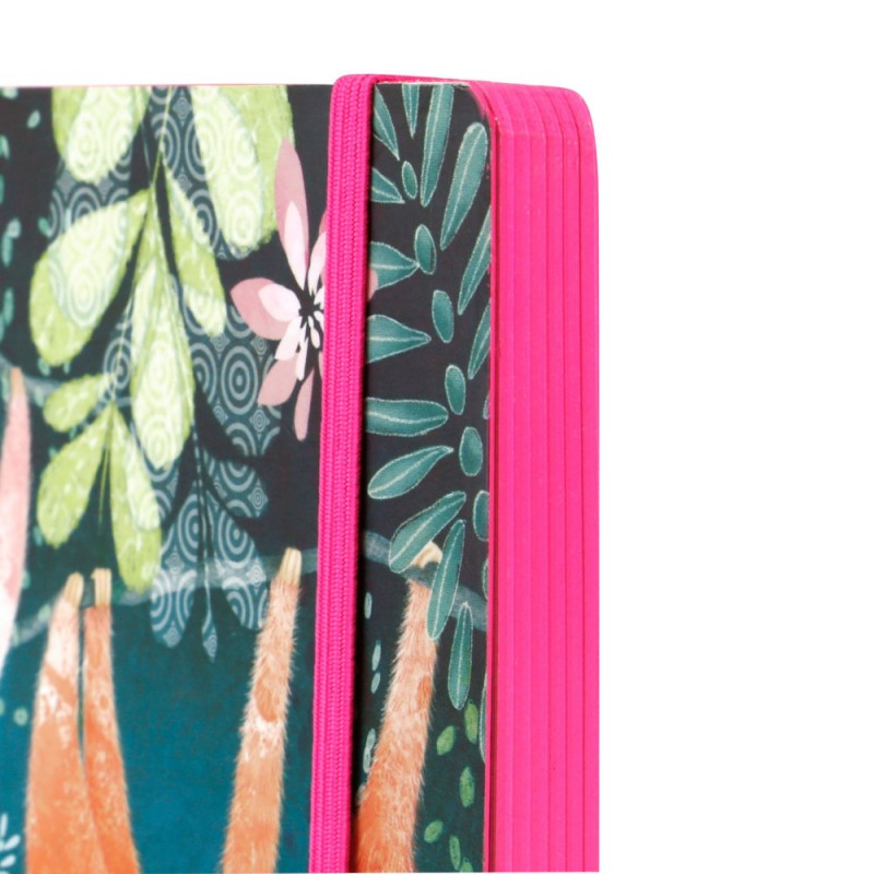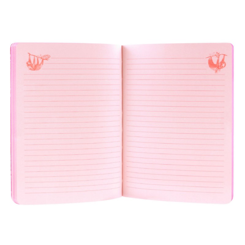 Santoro Carnetel A5 - Sloths are un design colorat si ilustratii diferite cu adorabilul animalut lenesul. Interiorul contine pagini liniate fin pentru o notare organizata, fiecare pagina avand un desen cu lenesul agatat de o ramura. Marginile de hartie au o culoare vibranta de zmeura. Acest carnetel are o inchidere cu un snur elastic colorat.