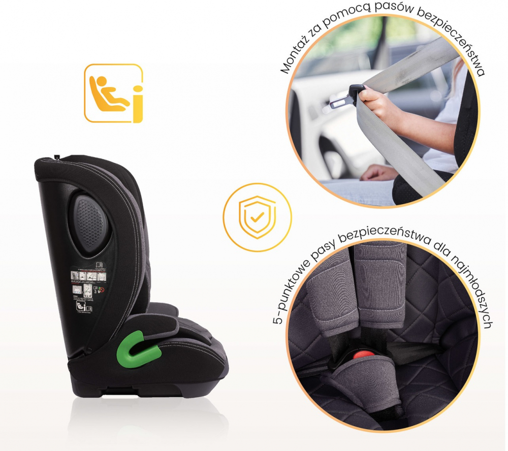 - Se instaleaza cu fata inainte folosind centurile de siguranta ale masinii, facilitand instalarea usoara in diverse vehicule, fara a necesita un sistem Isofix.