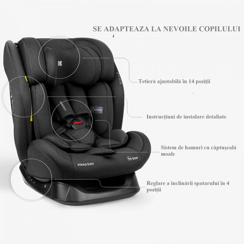 Scaun adaptabil: Se adapteaza pentru utilizare cu spatele la directia de mers, pentru copii cu inaltimea de la 40 la 105 cm, si cu fata la directia de mers, pentru cei cu inaltimea de la 100 la 150 cm, acoperind toate varstele, de la nou-nascut pana la aproximativ 12 ani (0-36 kg).