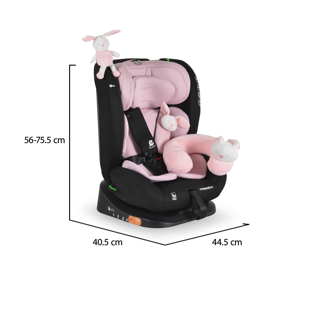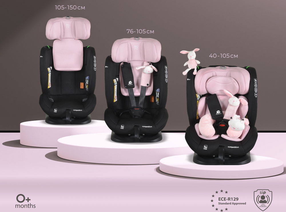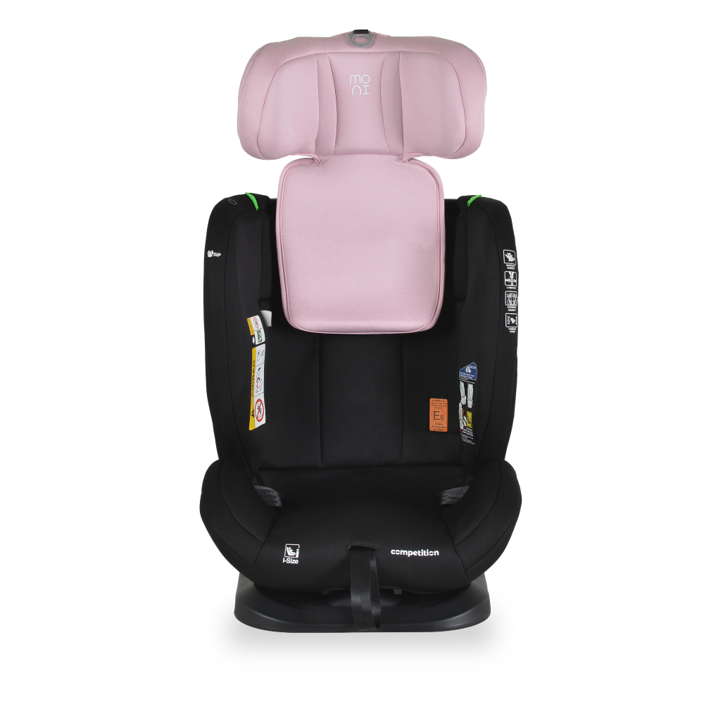 Scaun auto copii Moni Competition Baby Pink certificat I-Size 40-150 cm,sistem de fixare sonor BIP,spatar reglabil,protectie impact lateral,tetiera reglabila 10 pozitii,pernuta gat/jucarie plus si protectie centura incluse