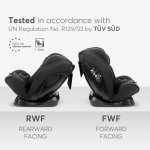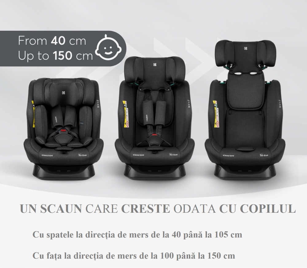 Scaun adaptabil: Se adapteaza pentru utilizare cu spatele la directia de mers, pentru copii cu inaltimea de la 40 la 105 cm, si cu fata la directia de mers, pentru cei cu inaltimea de la 100 la 150 cm, acoperind toate varstele, de la nou-nascut pana la aproximativ 12 ani (0-36 kg).