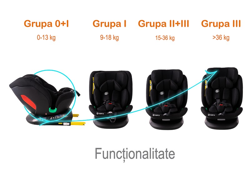 Scaunul este prevazut cu sistem pivotant care permite accesul mult mai facil al copilului in scaun, intrucat poate fi ROTIT 360 GRADE, inclusiv cu fata catre portiera masinii.