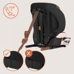 Levi Fix i-Size se instalează intuitiv, rapid și sigur. Pentru copiii mici (76–105 cm), se folosește Isofix + Top Tether și centura internă în 5 puncte. Pe măsură ce copilul crește (100–150 cm), scaunul poate fi utilizat fie cu Isofix + centura auto în 3 puncte, fie doar cu centura mașinii, ghidajele laterale asigurând poziționarea corectă a centurii.