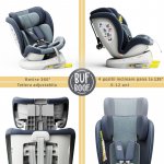 Scaunul este prevazut cu sistem pivotant care permite accesul mult mai facil al copilului in scaun, intrucat poate fi ROTIT 360 GRADE, inclusiv cu fata catre portiera masinii.