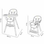 - scaun 2 in 1: scaun de masa inalt pentru bebelusi de la 6 luni pana la 3 ani sai 15 kg, ca mai apoi sa se poata transforma intr-un scaun jos pentru copiii de pana la 5 ani.