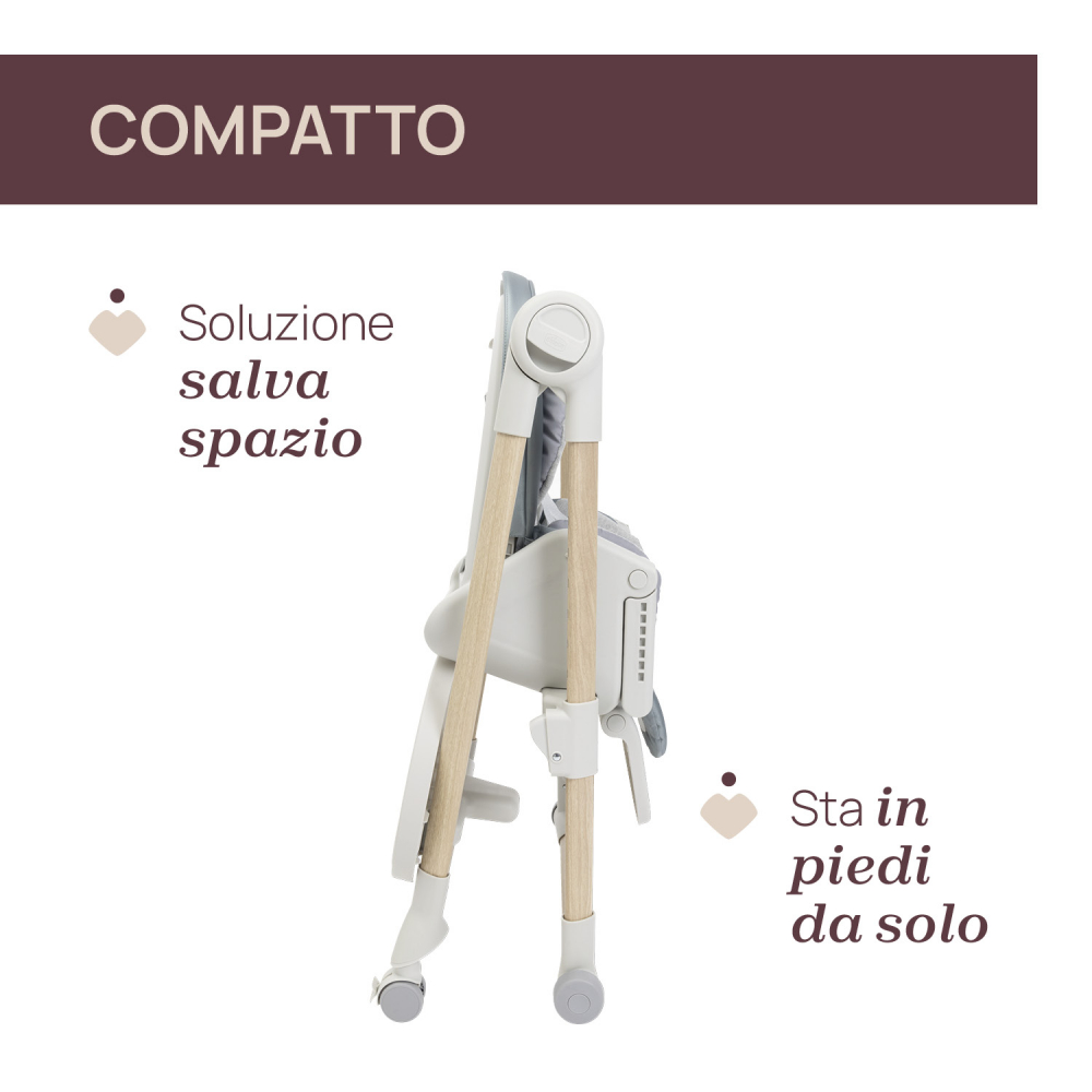 Scaunul se pliaza compact si poate sta in pozitie verticala atunci cand este inchis, economisind spatiu. Tava poate fi depozitata pe picioarele din spate, pentru acces rapid.