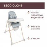 Cu 9 pozitii de inaltime diferite si un suport pentru picioare si tavita, ambele reglabile, Polly Armonia urmareste cresterea si nevoile copilului in fiecare etapa, oferindu-i confort si suport in mod continuu.