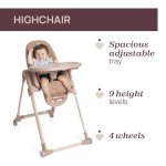 Cu 9 pozitii de inaltime diferite si un suport pentru picioare si tavita, ambele reglabile, Polly Armonia urmareste cresterea si nevoile copilului in fiecare etapa, oferindu-i confort si suport in mod continuu.