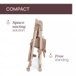 Scaunul se pliaza compact si poate sta in pozitie verticala atunci cand este inchis, economisind spatiu. Tava poate fi depozitata pe picioarele din spate, pentru acces rapid.