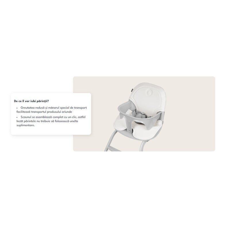 Greutatea redusa a scaunului doar 3,5 kg face ca acesta sa fie usor de mutat. Posibilitatea de a spala tavita in masina de spalat vase si tapiteria usor de intretinut simplifica utilizarea zilnica.