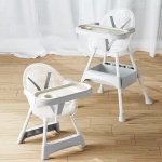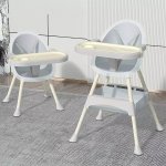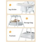 Scaun de masa Little Mom New Fashion Dinning Chair White/Pudra cu tavita dubla ajustabila, centuri de siguranta, husa detasabila din piele ecologica, suport pentru picioare, cos accesorii, picioare cu talpi aderente
