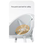 * Centura de siguranta in 5 puncte reglabila, cu opritor sub tavita pentru prevenirea caderii copilului