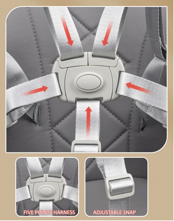 - Datorita hamului atasat cu fixare in 5 puncte, iti poti tine copilasul in siguranta pe scaunul inalt, fara a-i limita spatiul.