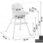 - Masuta reglabila, detasabila: Scaunul inalt va permite sa reglati liber distanta tavii fata de copil. De asemenea, pot fi demontate complet in orice moment. reglare tavita impingere/tragere posibilitatea demontarii complete