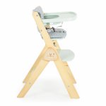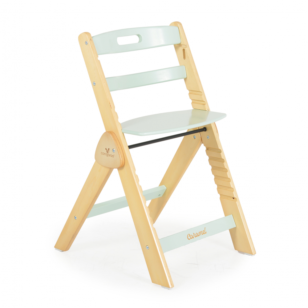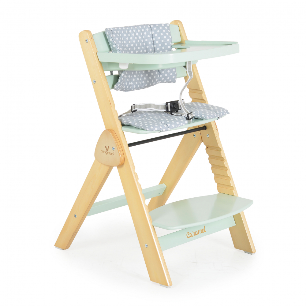 Scaun de masa multifunctional Cangaroo Caramel Mint 2in1 din lemn cu sezut reglabil 3 nivele,de la 6luni,suport picioare reglabil 6 nivele,pliere compacta,centura de siguranta,pernuta moale inclusa,picioare antiderapante
