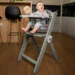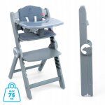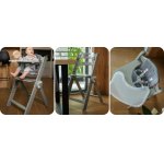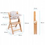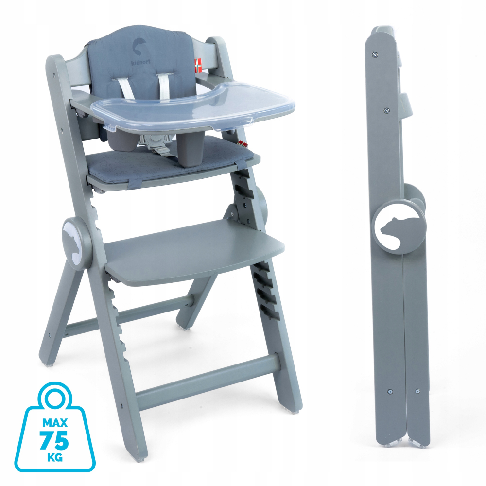 Scaun de masa pentru copii, Kidnort Drommer Unique Grey, pliabil, structura din lemn, cu 9 configuratii de inaltime, centura de siguranta in 5 puncte, pana la 75 kg, dimensiune 59 x 46 x 79.5 cm, perna de sezut inclusa