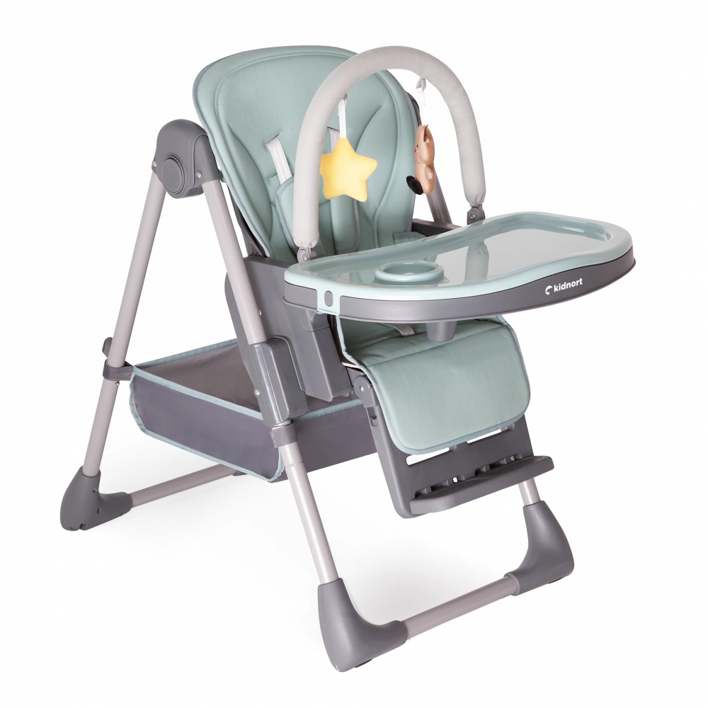 Scaun de masa pentru copii, Kidnort Jordgubbe Green, multifunctional, cu roti, bara de jucarii, spatar reglabil, pozitie somn, reglabil pe inaltime pe 6 nivele, tavita cu suport pentru pahar, usor de pliat