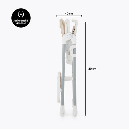 Scaunul inalt are toate caracteristicile pentru a face hranirea zilnica mai usoara: centura de siguranta in 5 puncte, spatar reglabil, suport pentru picioare, tava dubla cu blat care poate fi spalat vase si este usor de pliat si curatat.
