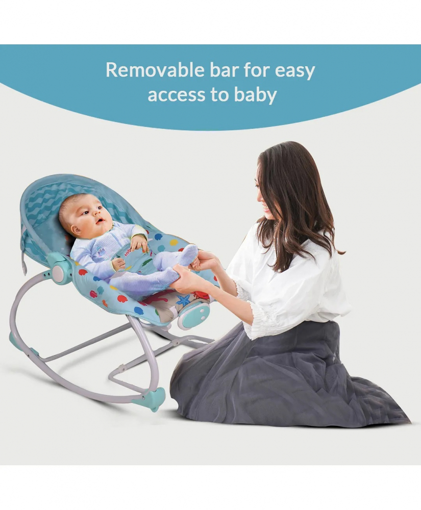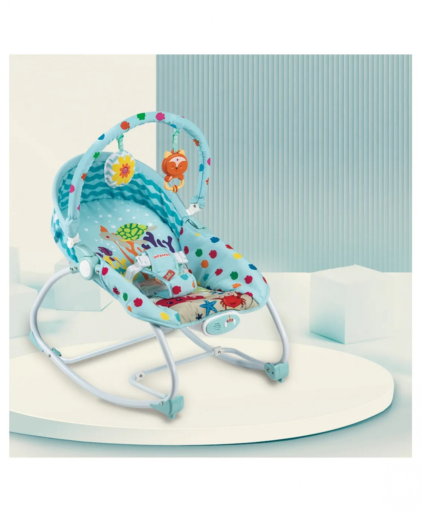 Scaunel balansoar multifunctional pentru bebelusi, cu bara de jucarii detasabila, ham de siguranta in 3 puncte, spatar reglabil in 2 pozitii si functie de vibratii, 50 x 30 x 8 cm, Marine Life
