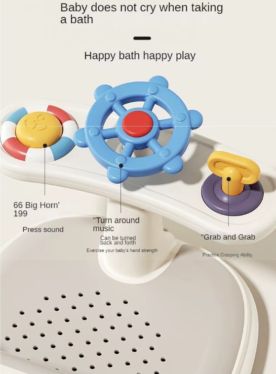 Scaunel de baie pentru copii Little Mom Cream Sailor, ghidon de sustinere echipat cu jucarii sonore, design ergonomic cu spatar, husa detasabila din cauciuc, fixare cu ventuze, dimensiune 20 x 39 x 23.5 cm