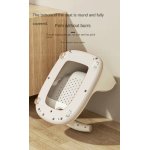 - Husa scaunelului este confectionata dintr-un cauciuc moale si placut la atingere, oferind un plus de confort. Aceasta este detasabila si prevazuta cu gaurele mici ingenioase, care permit o scurgere rapida a apei, mentinand astfel scaunelul curat si igienizat dupa fiecare utilizare.