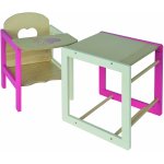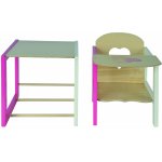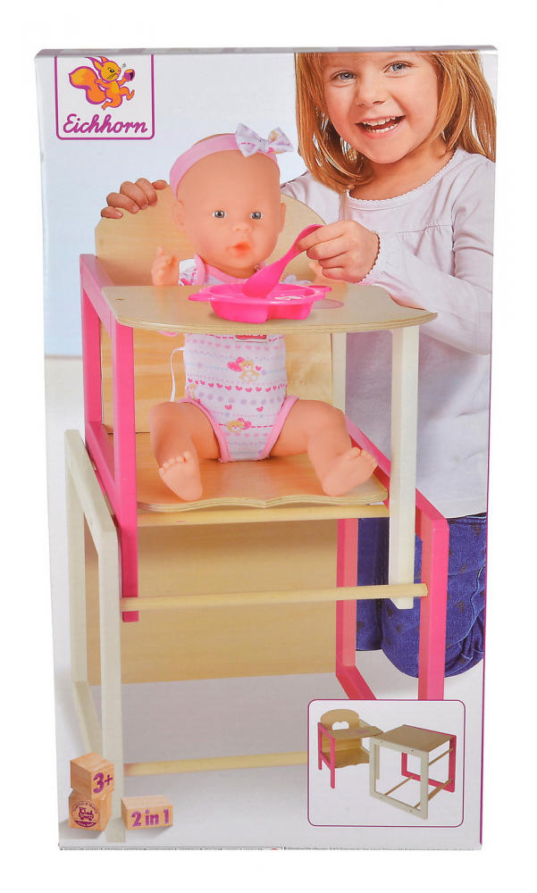 Cei mici se pot juca cu scaunul inalt al papusii conectat impreuna cu masa, dar si il pot demonta cu o optiune de conectare foarte usoara si il pot transforma intr-un scaun si masa separate si se pot juca cu el.