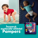 Scutecele-chilotel Pampers Pants sunt primele scutece-chilotel cu buzunar Stop & Protect care, in combinatie cu fixarea de jur-imprejur, ofera protectie impotriva scurgerilor de orice fel de pana la 12 ore.
