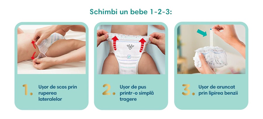 Scutecele-chilotel Pampers Premium Care Pants sunt prevazute cu 3 canale absorbante, care ajuta la distribuirea uniforma a umezelii.
