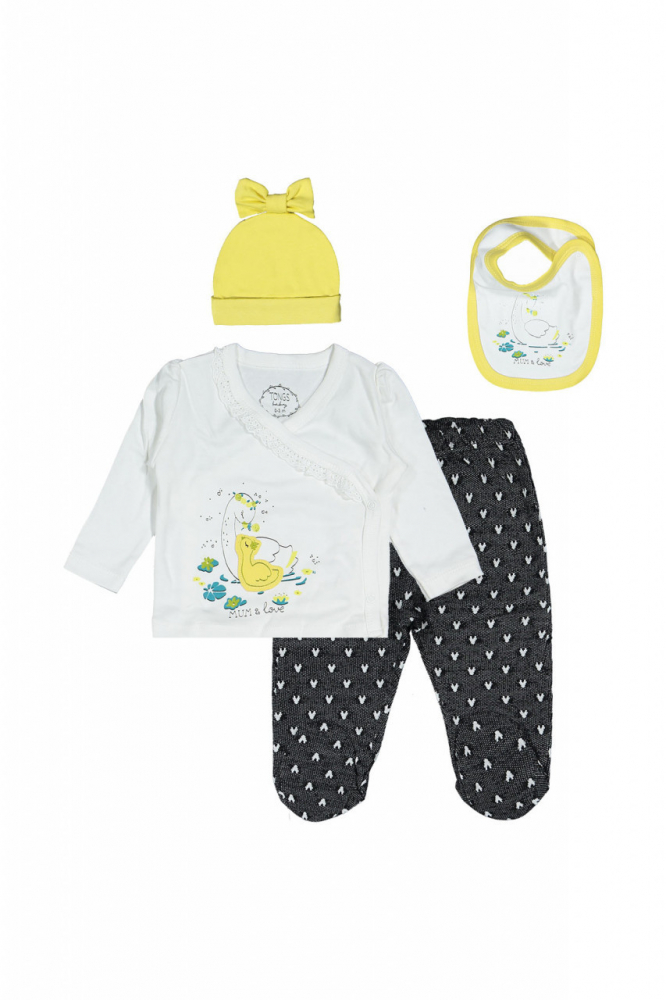 Set complet de nou-nascut 10 piese cu imprimeu cu lebada confectionat din cel mai din calitativ bumbac, delicat cu pielea gingasa a bebelusului.