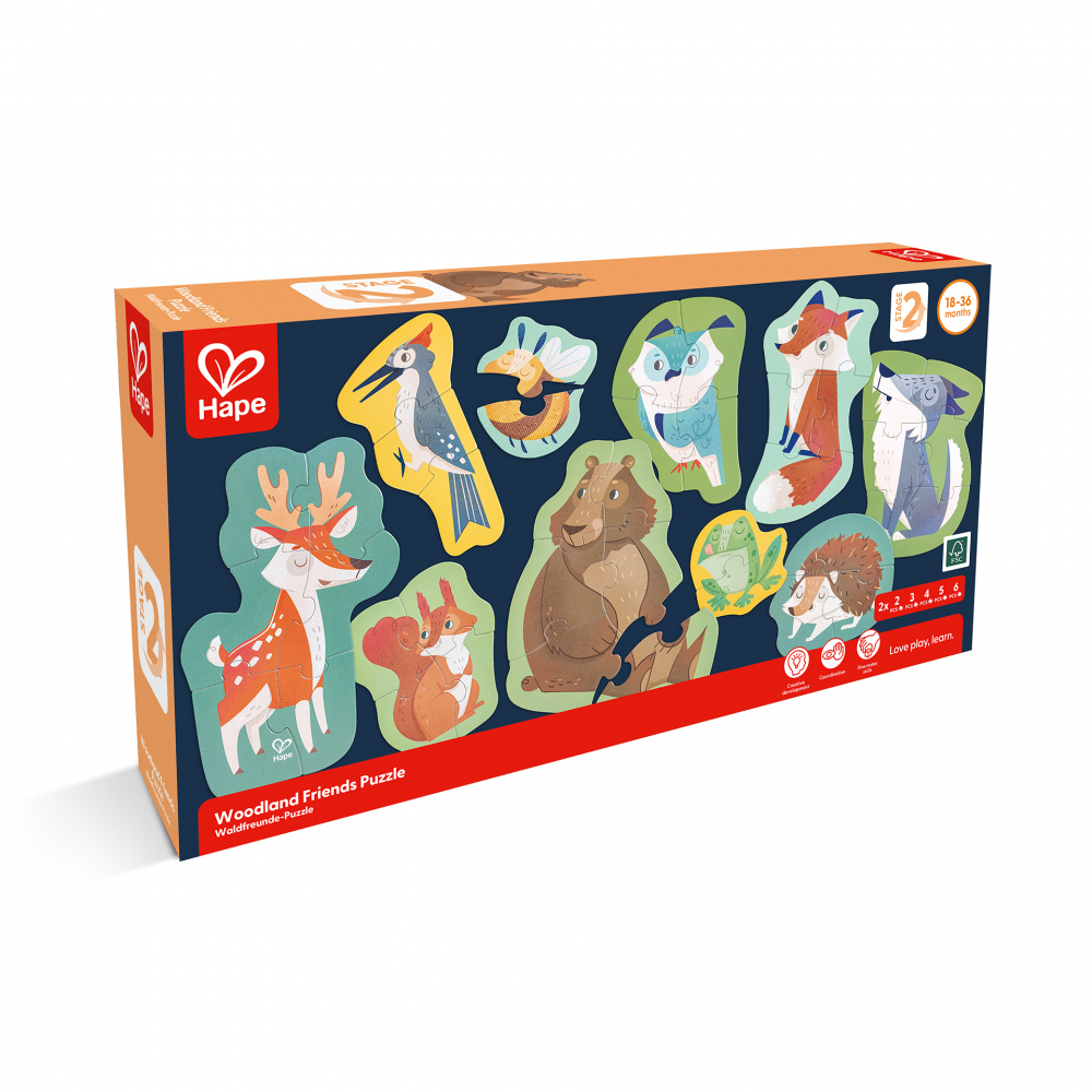 Acest set de puzzle include zece puzzle-uri adorabile cu animale din padure in forma de albina, caprioara, vulpe, ciocanitoare, broasca, urs, bufnita, veverita, lup si arici.