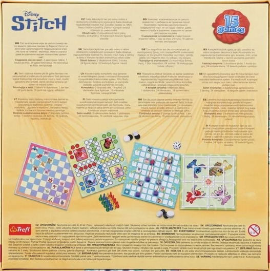 Cutia include jocuri clasice reinterpretate cu personaje indragite din universul Stitch, precum dame, sah, Serpi si Scari, Ludo si multe altele.