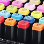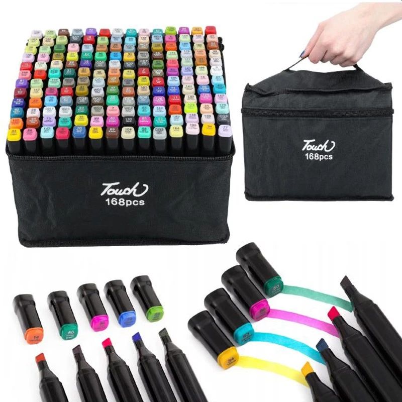 Setul este format din 168 markere duble potrivite pentru diferite schite, desene, scris, etc si sunt ideale atat pentru elevi cat si pentru studenti. Geanta este prevazuta cu fermoar, dar si 5 organizatoare cu ajutorul carora markerele pot fi asezate si organizate cu usurinta.