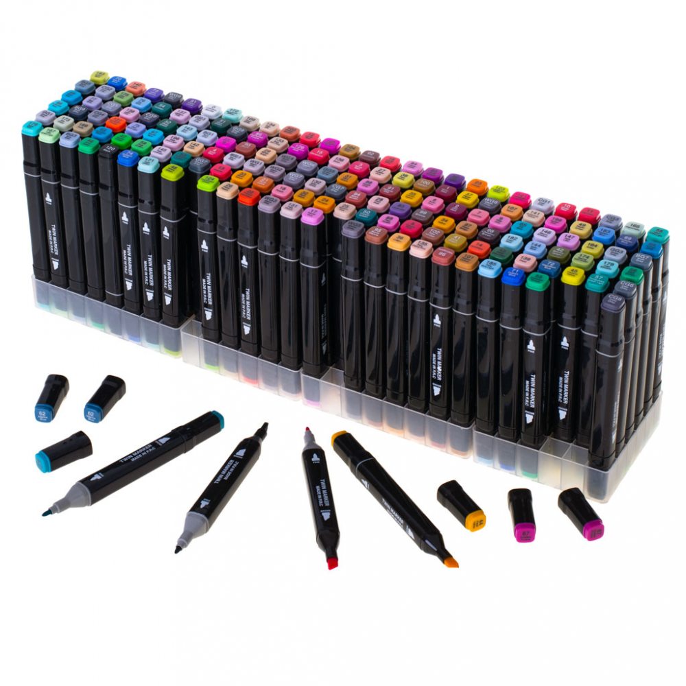 Set 168 markere duble multicolore Ikonka, in gentuta cu fermoar si suport de sustinere inclus