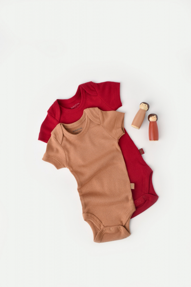 Set 2 body-uri cu maneca scurta Baby Cosy din bumbac organic si modal Maro/Rosu marime 0-3 luni