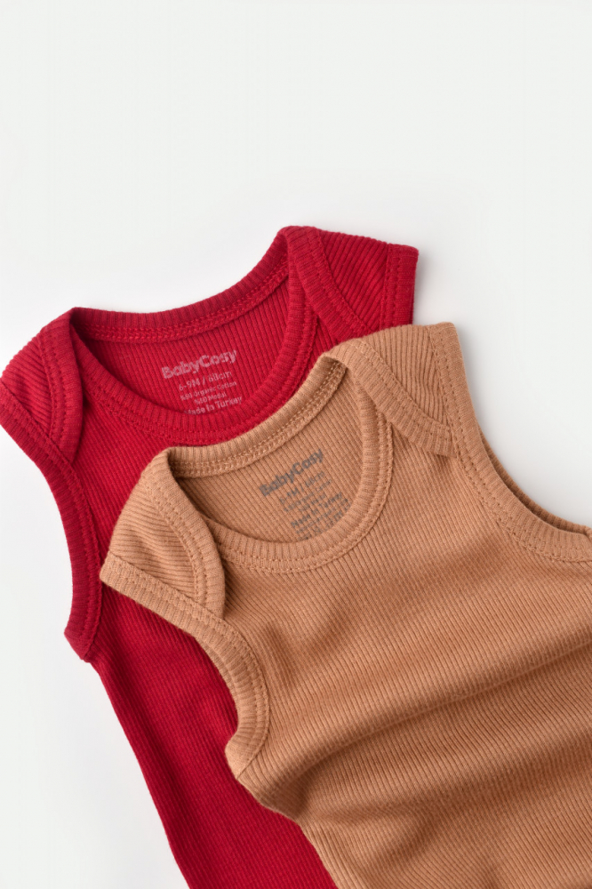 Set 2 body-uri fara maneci din bumbac organic si modal Maro-Rosu Baby Cosy marime 18-24 luni