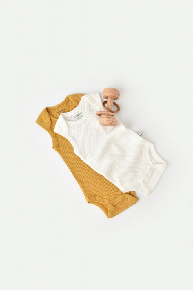 Set 2 body-uri fara maneci din bumbac organic si modal Mustar-Ecru Baby Cosy marime 3-6 luni