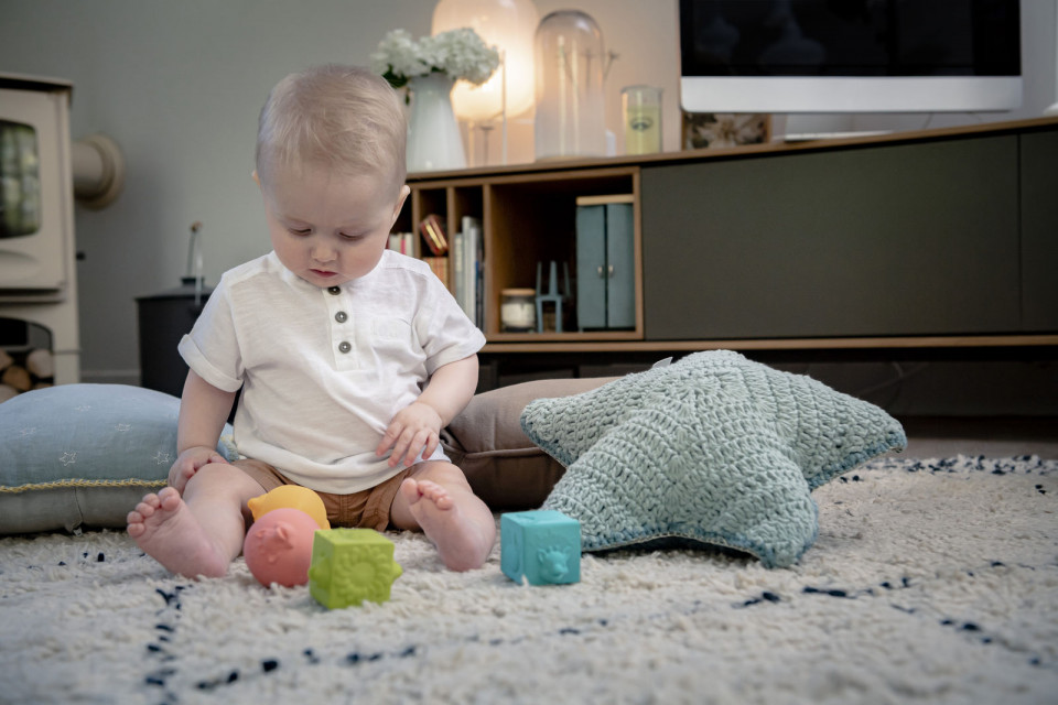 Un set foarte colorat care combina doua jucarii indragite: - 2 mingi din cauciuc natural - 2 cuburi din cauciuc natural. Acest tip de jucarii dezvolta simtul tactil si dexteritatea.