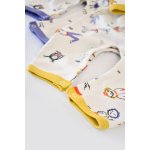 - Este realizat din bumbac organic 100% - material certificat GOTS, delicat cu pielea gingasa a a bebelusului. Printurile sunt cu vopseluri pe baza de apa si toate produsele sunt in concordanta cu standardele GOTS.