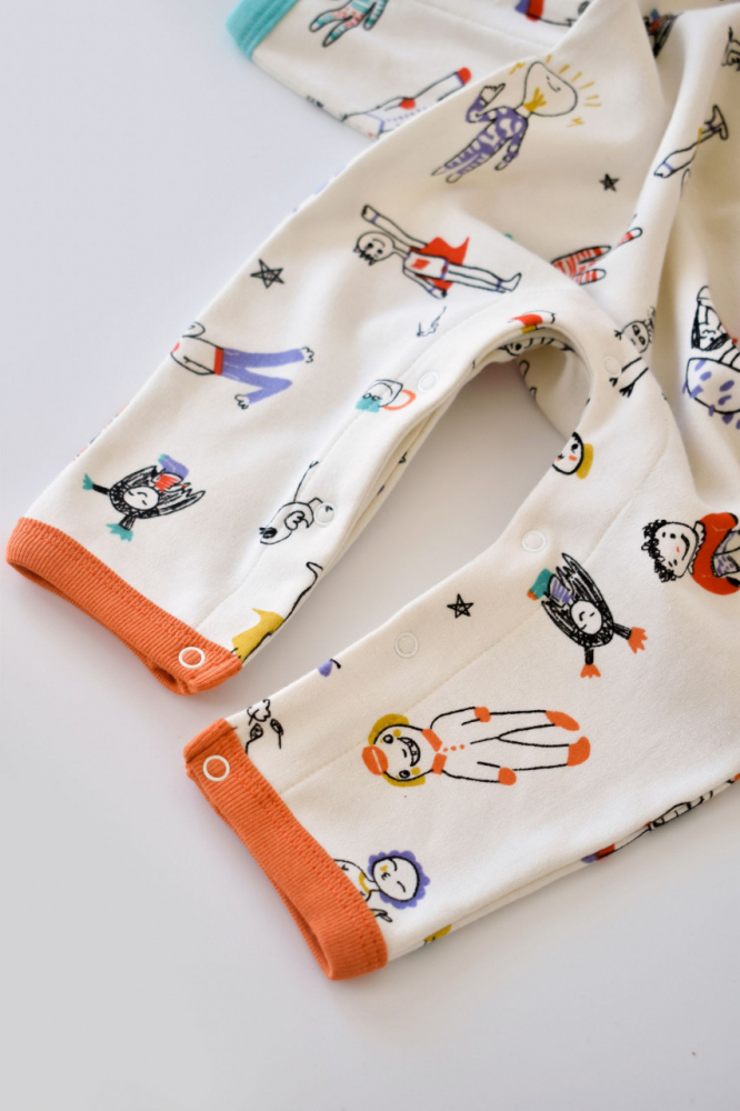 - Este realizat din bumbac organic 100% - material certificat GOTS, delicat cu pielea gingasa a a bebelusului. Printurile sunt cu vopseluri pe baza de apa si toate produsele sunt in concordanta cu standardele GOTS.